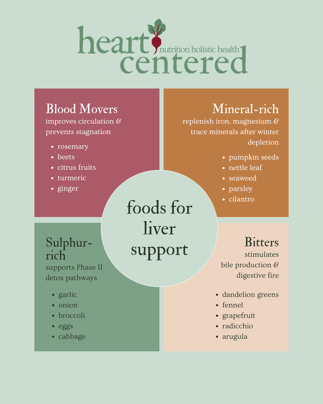 Supporting the liver during this time can help improve energy, digestion, skin health, and hormone balance while reducing symptoms such as bloating, irritability, headaches, PMS, and sluggish digestion.