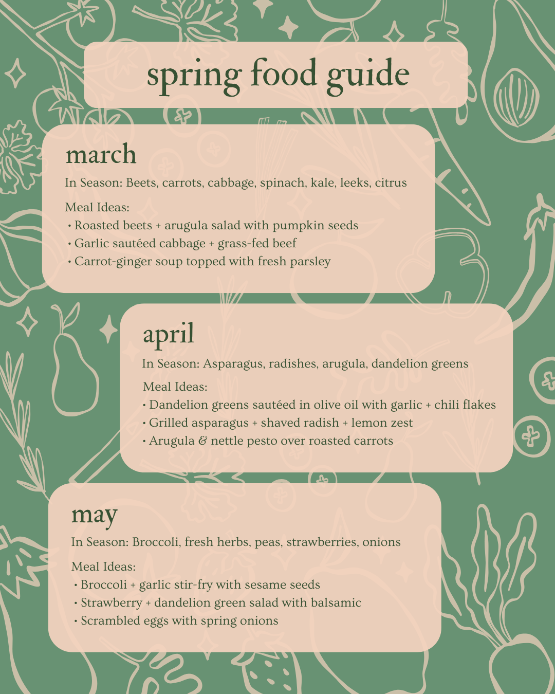 Browse below for the full, simple recipes using in-season produce for March, April, and May.